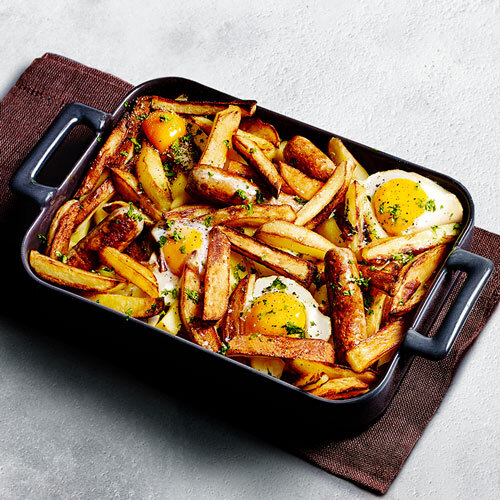 We’ve levelled up that childhood classic sausage and beans combo with a layer of crispy golden potatoes.