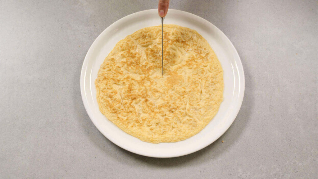 2. Lay your omelette out on a cutting board. Use a knife to make a cut from the middle of the omelette down to the edge.