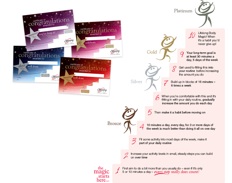 Slimming World’s active lifestyle programme allows members to build their activity levels at their own pace and rewards the incremental introduction of daily exercise.
