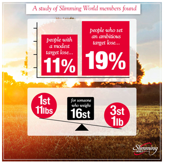 A study, led by researchers at Nottingham University, published in the Journal of Human Nutrition and Dietetics, looked at the impact of target setting in 24,457 Slimming World members with a BMI >30kg/m², who were all attending weekly group support sessions. They found that people who set a target were 10 times more likely to be successful than those who didn't set a goal, while the more ambitious the target, the more weight people lost – regardless of their starting weight.