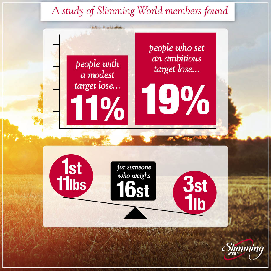 A study, led by researchers at Nottingham University, published in the Journal of Human Nutrition and Dietetics looked at the impact of target setting in 24,457 Slimming World members with a BMI >30kg/m², who were all attending weekly group support sessions. It found that the more ambitious the target, the more weight people lost* – regardless of their starting weight.