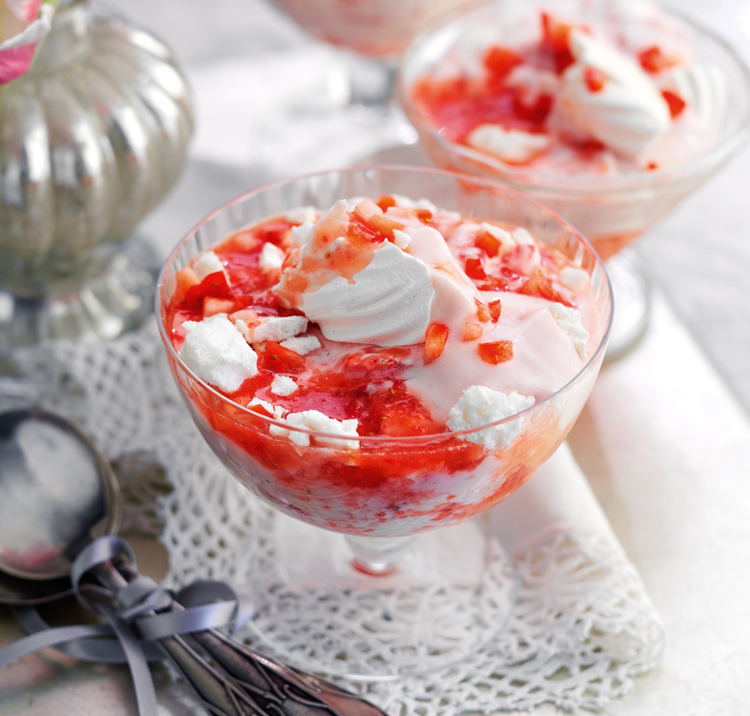 Fold in the crushed meringue and divide the mixture between 4 chilled dessert glasses. Top with the finely chopped strawberries and serve straight away.